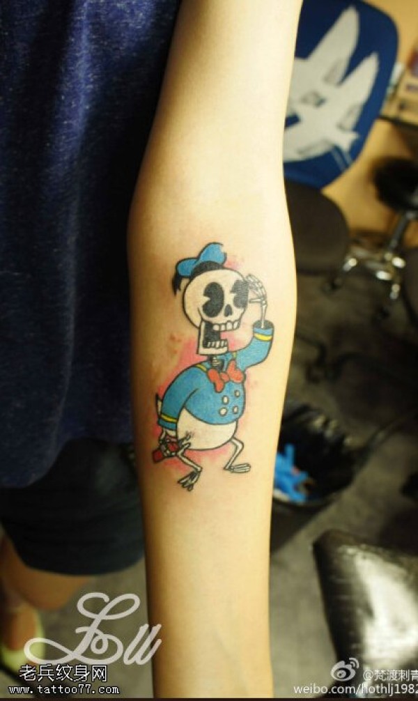 手臂彩色可爱的骷髅唐老鸭文身作品