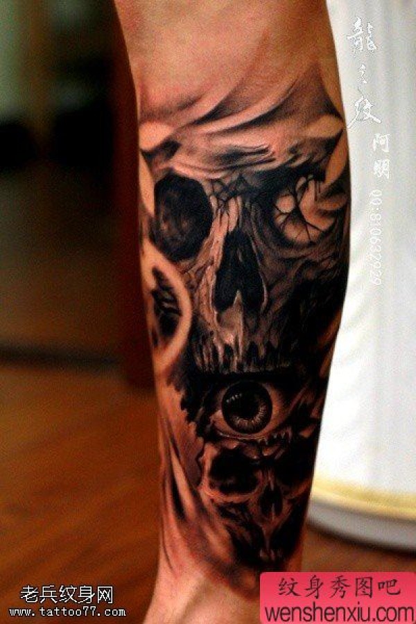 腿部欧美骷髅眼睛文身作品由文身馆分享