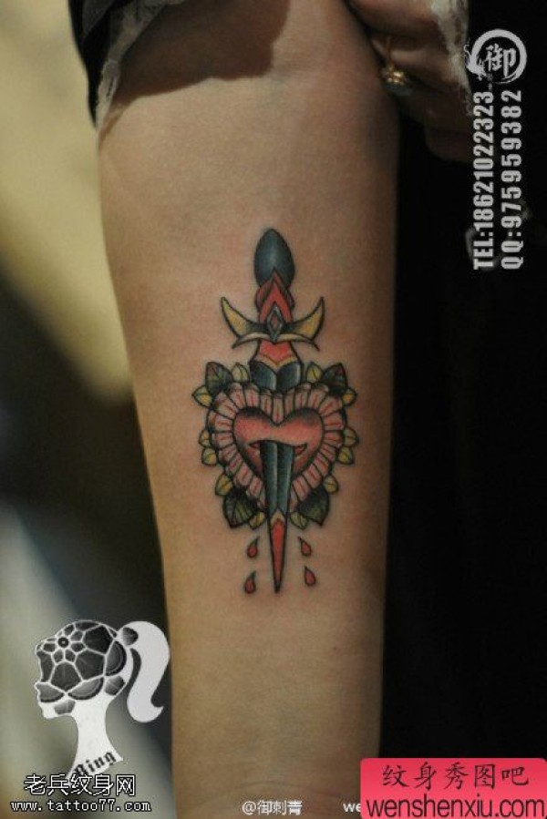 手臂彩色匕首爱心文身作品由最好的刺青分享