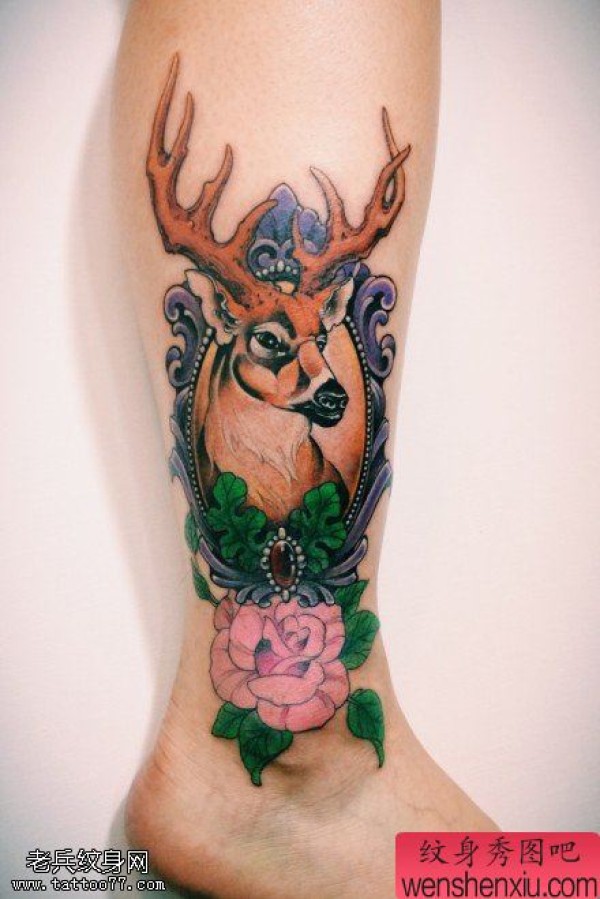 女性脚踝羚羊玫瑰花文身作品由纹身图吧分享