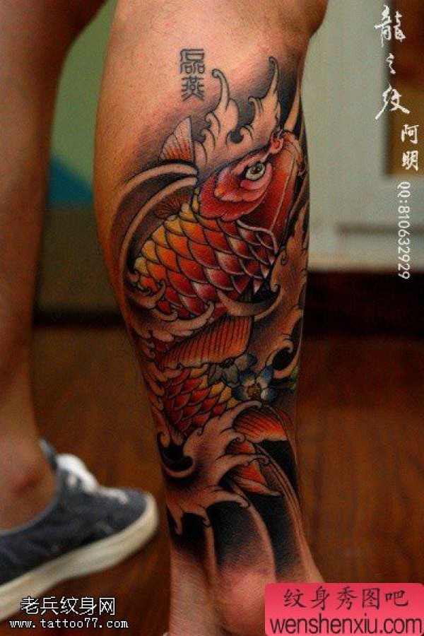 包腿彩色鲤鱼文身作品由文身馆分享