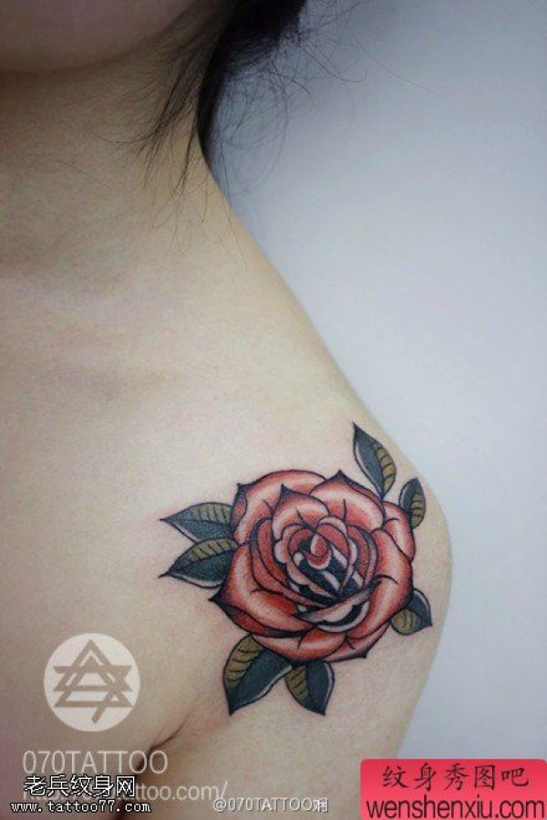 女性肩部彩色玫瑰花文身作品由纹身图吧分享