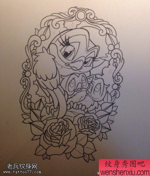 猫头鹰玫瑰花文身手稿作品由文身分享
