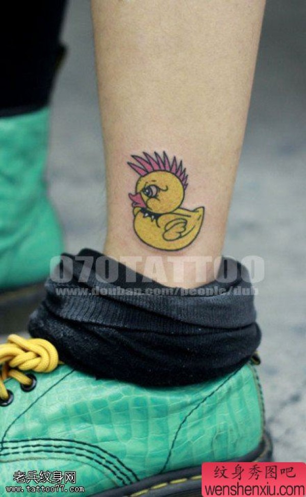 脚踝彩色小黄鸭文身作品由纹身图吧分享