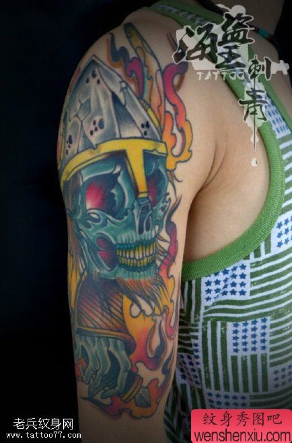 手臂SCHOOL骷髅士兵文身作品由纹身图吧分享