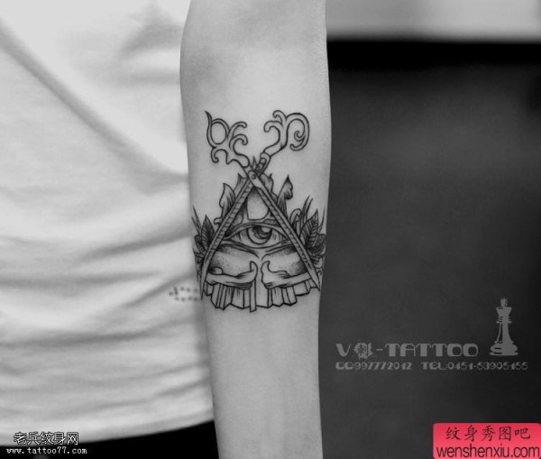 黑白手臂上帝之眼文身作品由纹身图吧分享