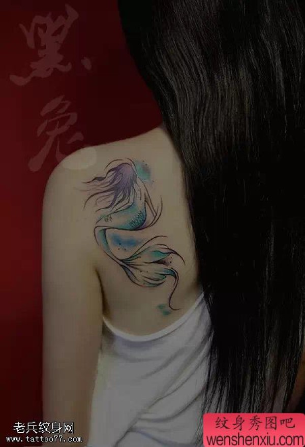 纹身图吧分享一张女性肩部泼墨美人鱼文身作品