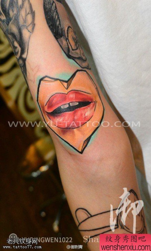 纹身图吧分享一张手臂school爱心嘴唇文身作品
