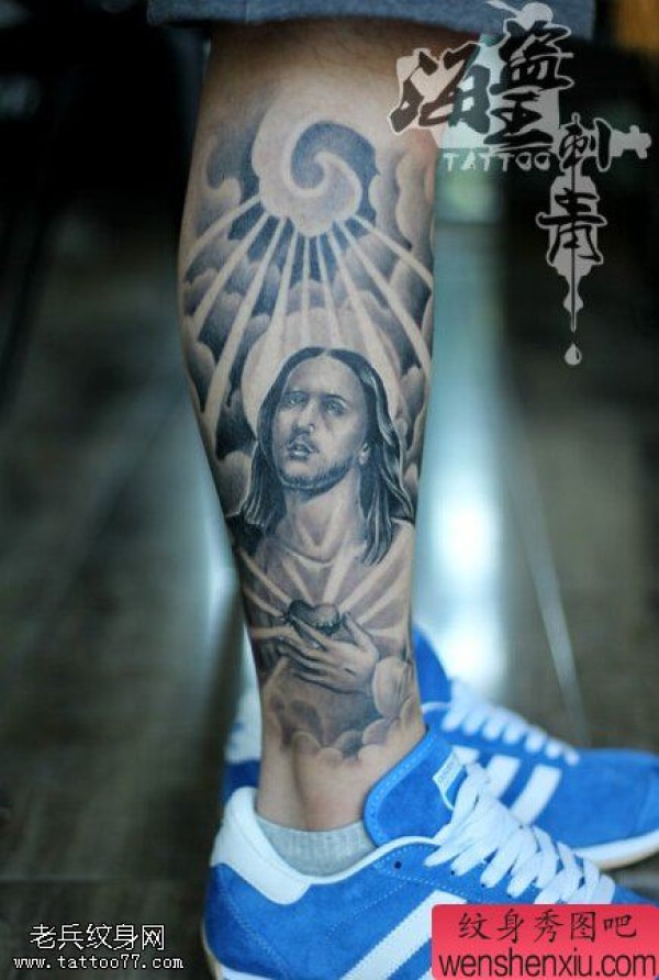 腿部黑白耶稣文身作品由纹身图吧分享