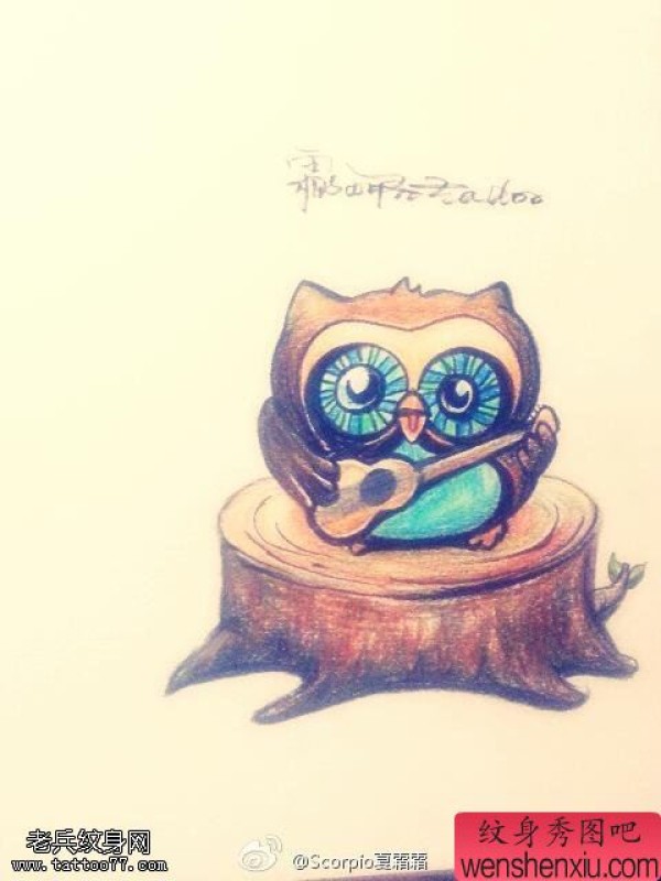 彩色萌神猫头鹰文身手稿作品由文身分享