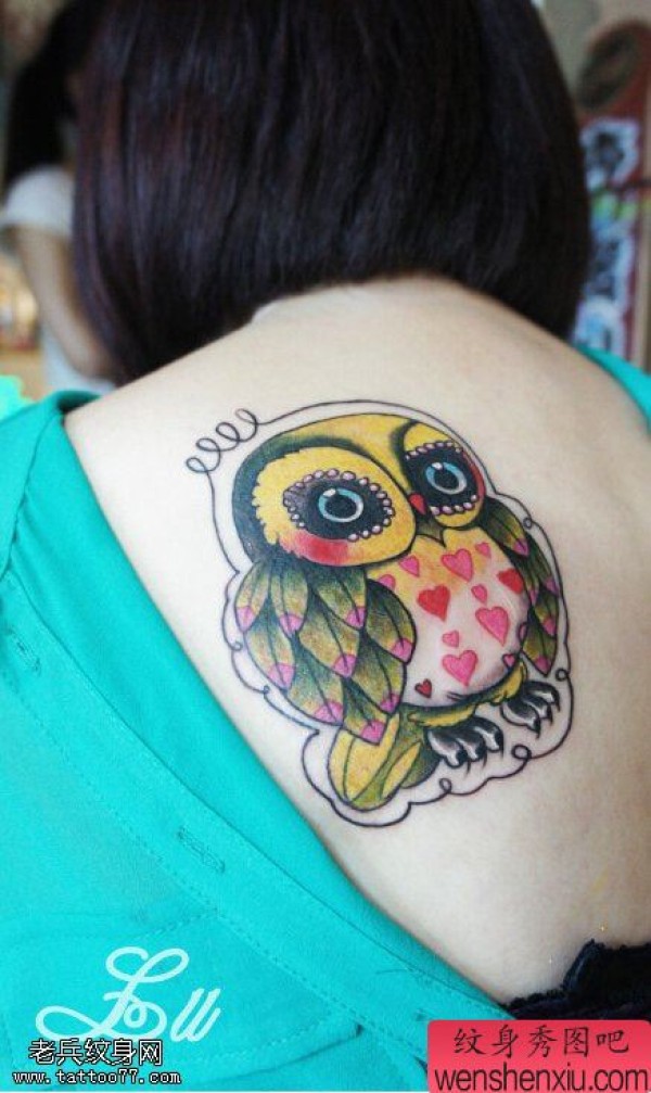 女性背部彩色猫头鹰文身作品由纹身图吧分享