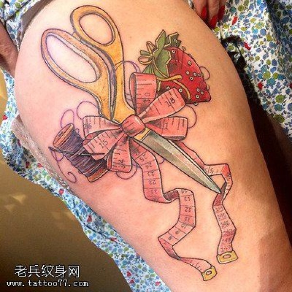 女性腿部剪刀蝴蝶结草莓文身作品由纹身图吧分享