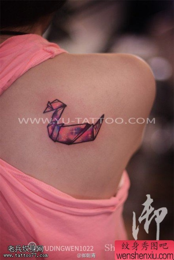 纹身图吧分享一张女性背部彩色千纸鹤文身作品