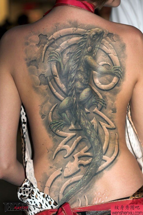 美女后背上一款立体蜥蜴纹身图案