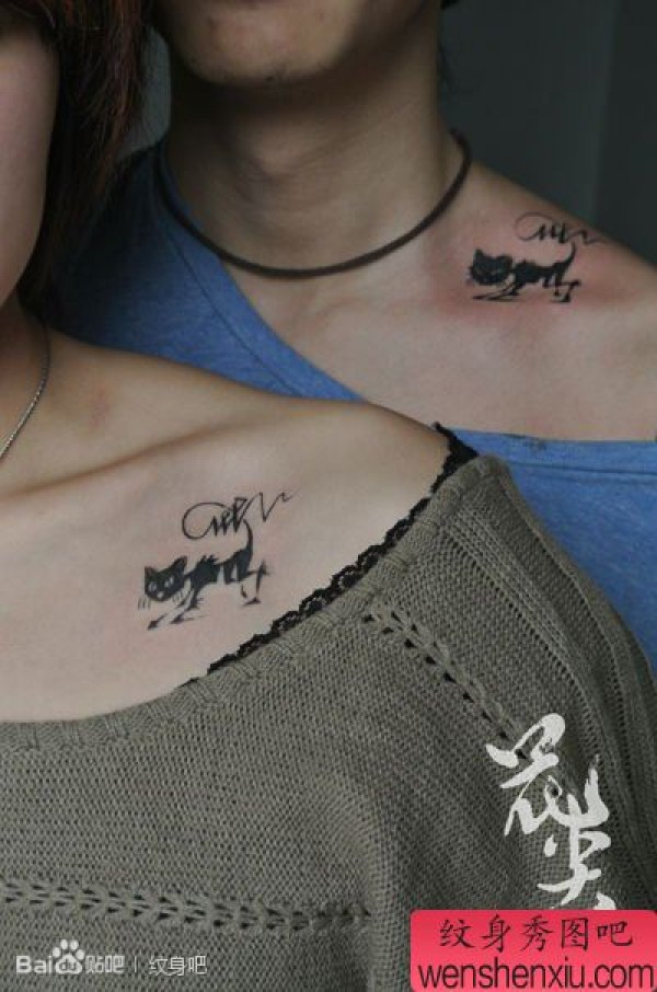 锁骨处时尚时尚的情侣猫咪纹身图案