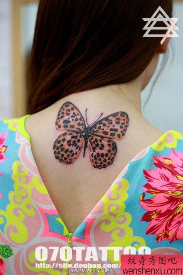 女生后脖子精美漂亮的豹纹蝴蝶纹身图案