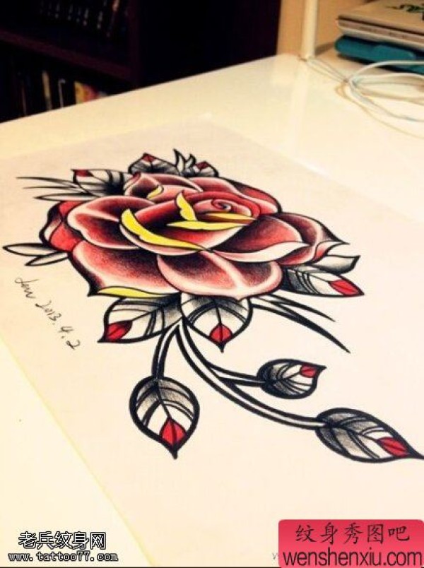 纹身图吧分享一张彩色玫瑰花文身手稿作品