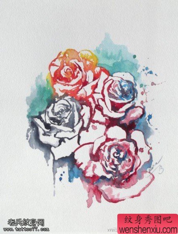 一张彩色水墨玫瑰花文身手稿作品由文身分享