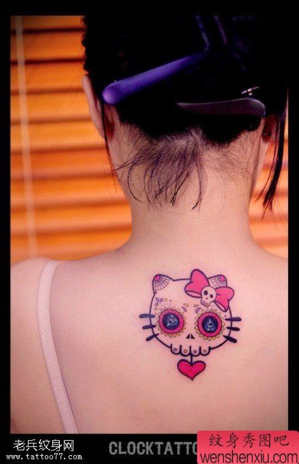 纹身图吧分享一张女性背部卡通猫咪文身作品