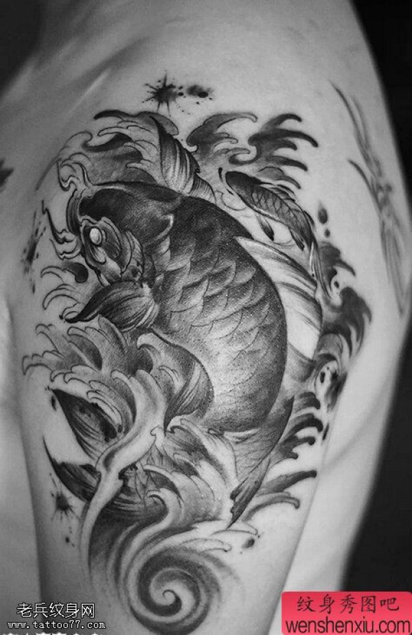 大臂水墨鲤鱼文身作品由纹身图吧分享