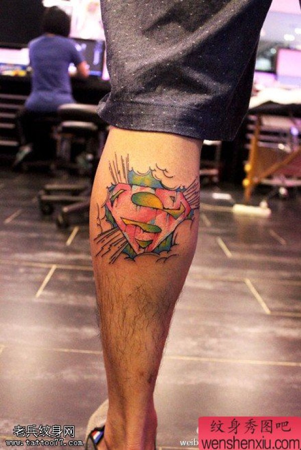 腿部彩色超人标志文身作品
