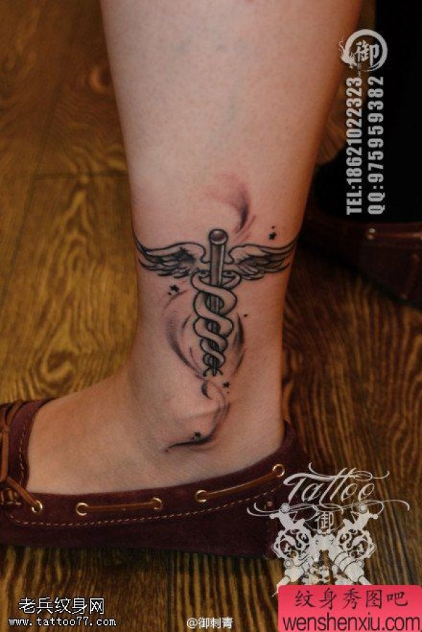 纹身图吧分享一张女性脚踝十字架翅膀文身作品