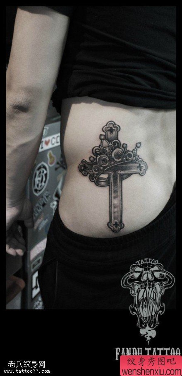 纹身图吧分享一张侧腰十字架文身作品