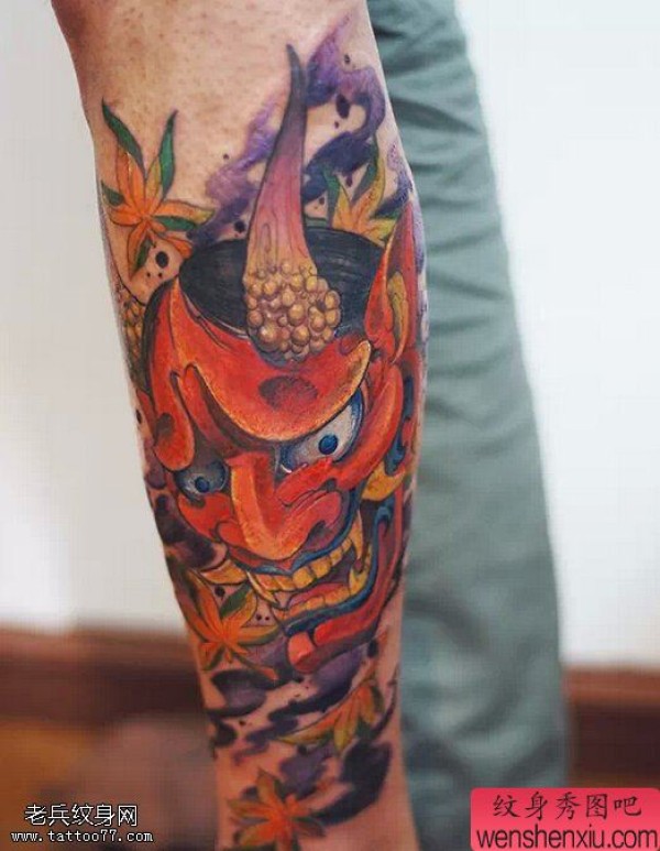 纹身图吧分享一张腿部彩色传统般若文身作品