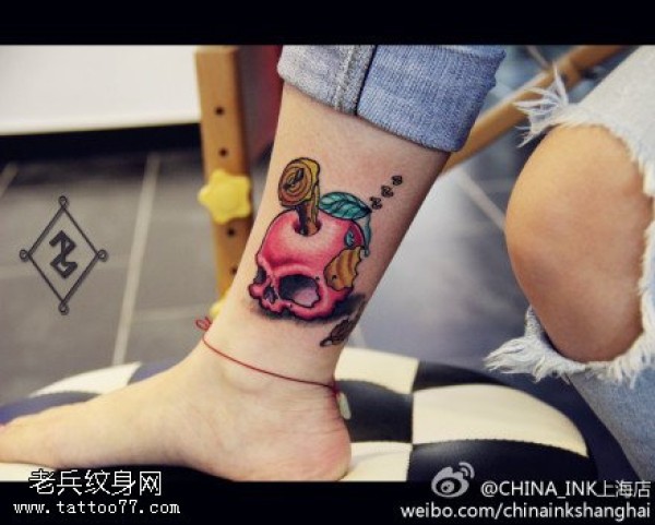 女性腿部彩色小苹果文身作品