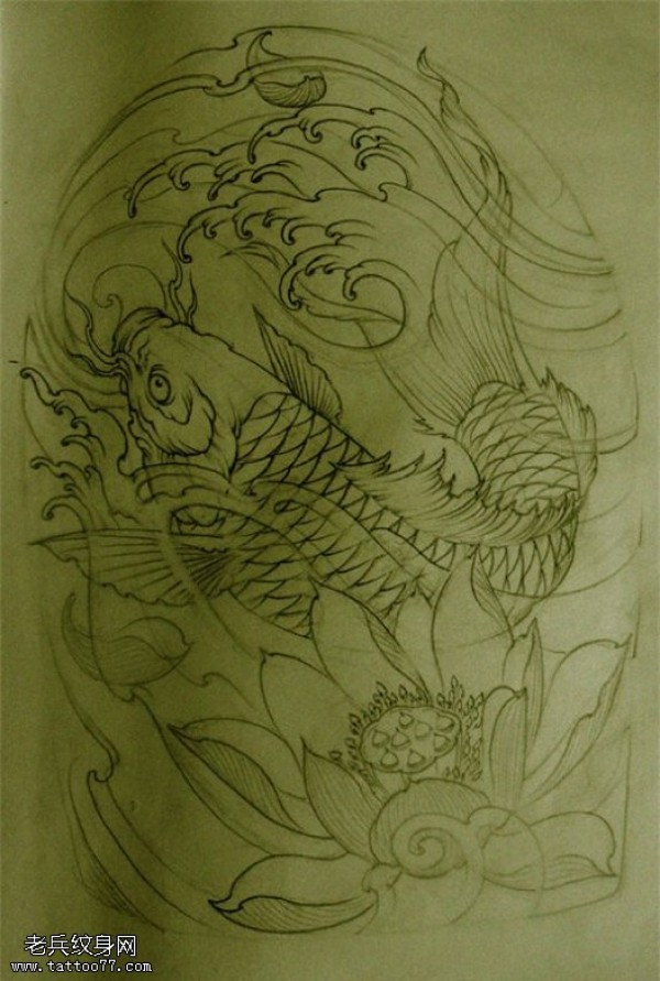 纹身图吧分享一张鲤鱼莲花线稿文身作品