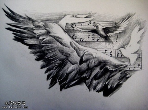 纹身图吧分享一张翅膀音符文身手稿作品