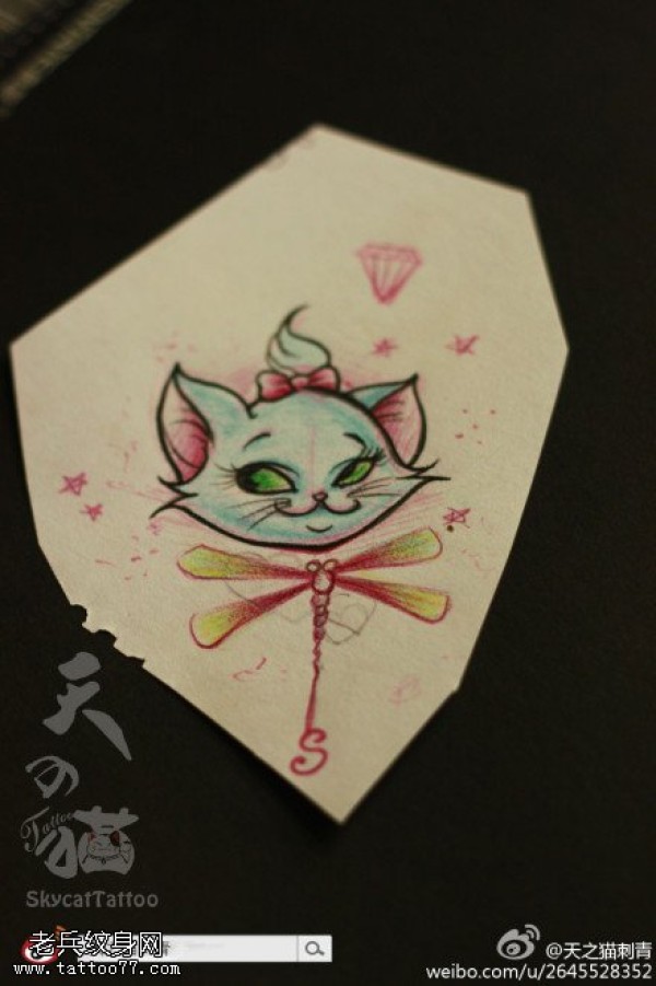 纹身图吧分享一张彩色猫咪蜻蜓文身作品