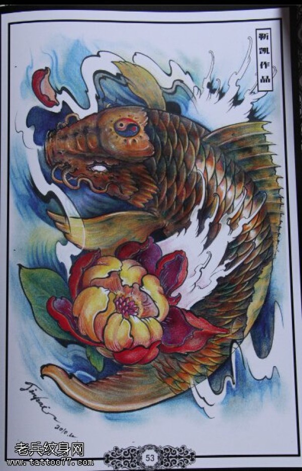 彩色传统鲤鱼莲花文身手稿作品