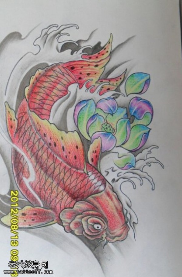 彩色鲤鱼莲花文身作品由纹身图吧分享