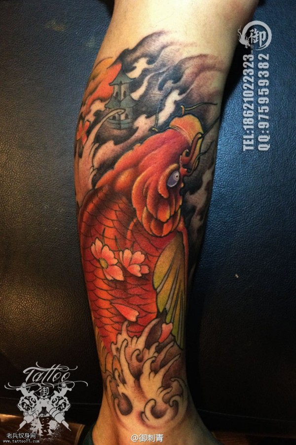 传统鲤鱼花小腿纹身_腿部纹身图案大全_纹身图吧
