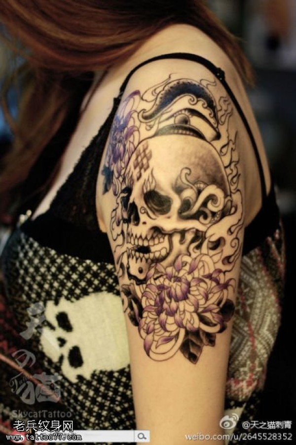 女性手臂骷髅菊花文身作品由刺青店分享
