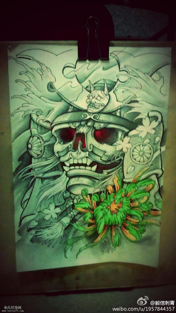 彩色骷髅武士菊花文身手稿作品