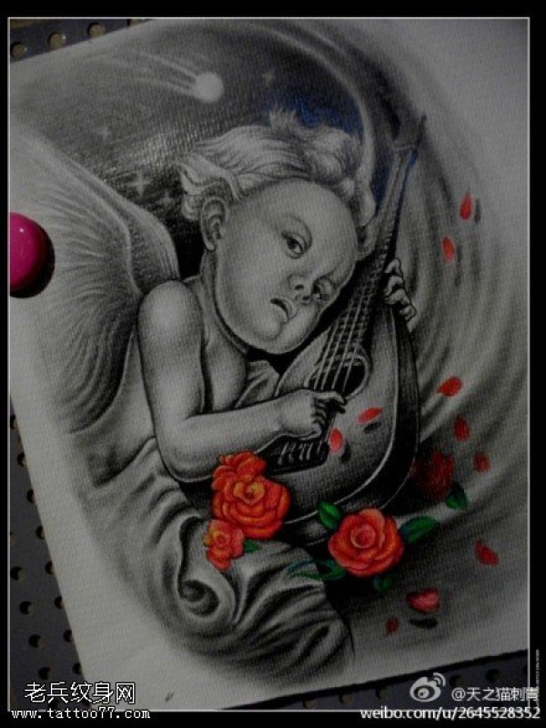 纹身图吧分享一张天使玫瑰花文身手稿作品