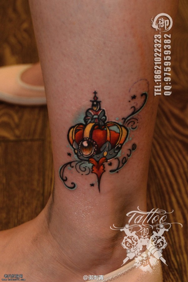 一张女性脚踝彩色小皇冠文身作品由文身分享