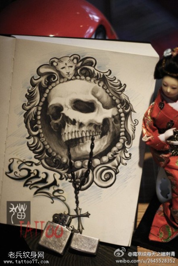 骷髅头十字架文身手稿作品由纹身图吧分享