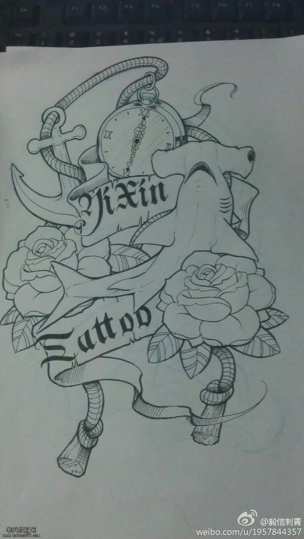 时钟船锚鲨鱼玫瑰花文身手稿作品