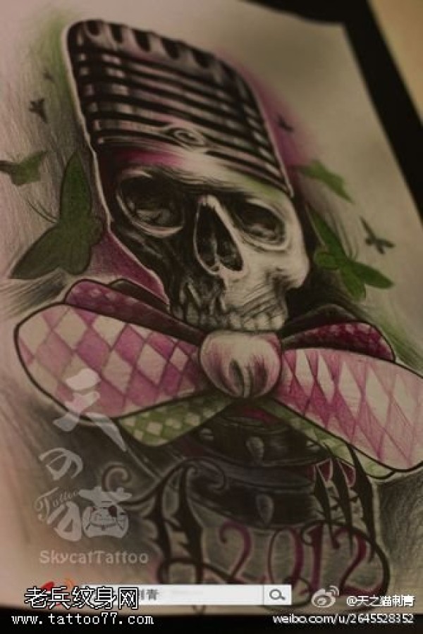 纹身图吧分享一张骷髅蝴蝶结文身手稿作品