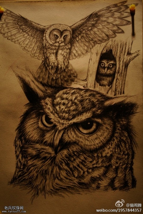 黑白猫头鹰老鹰文身手稿作品由文身分享