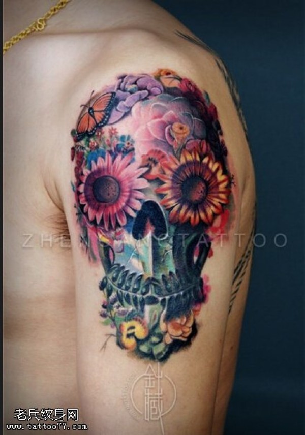 手臂彩色花骷髅文身作品由纹身图吧分享