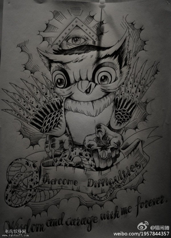 纹身图吧分享一张猫头鹰蛇字母上帝之眼文身手稿作品