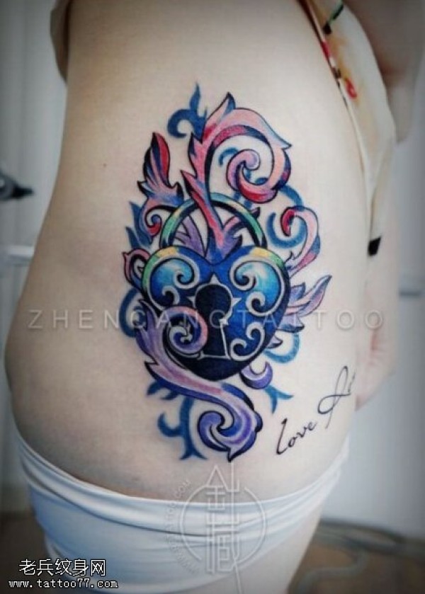 纹身图吧分享一张女性侧腰彩色钥匙文身作品