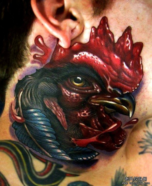 脖子上一款逼真的公鸡纹身图案