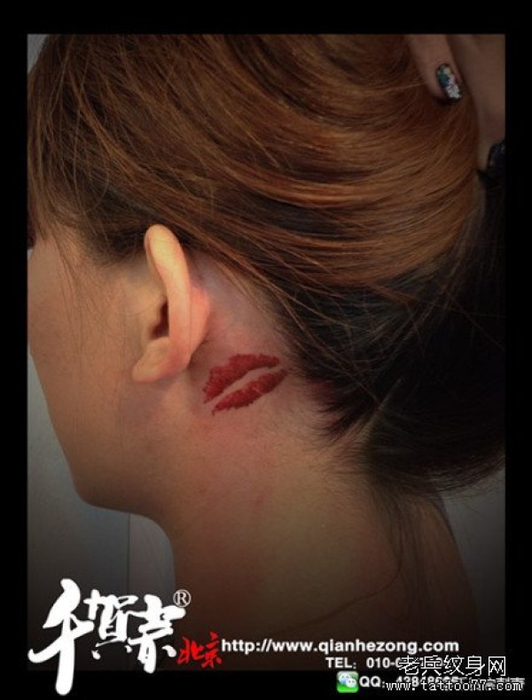 女生脖子处潮流唯美的唇印纹身图案