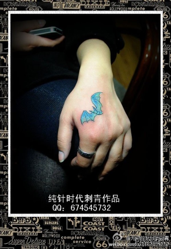 女生手部彩色小蝙蝠纹身图案