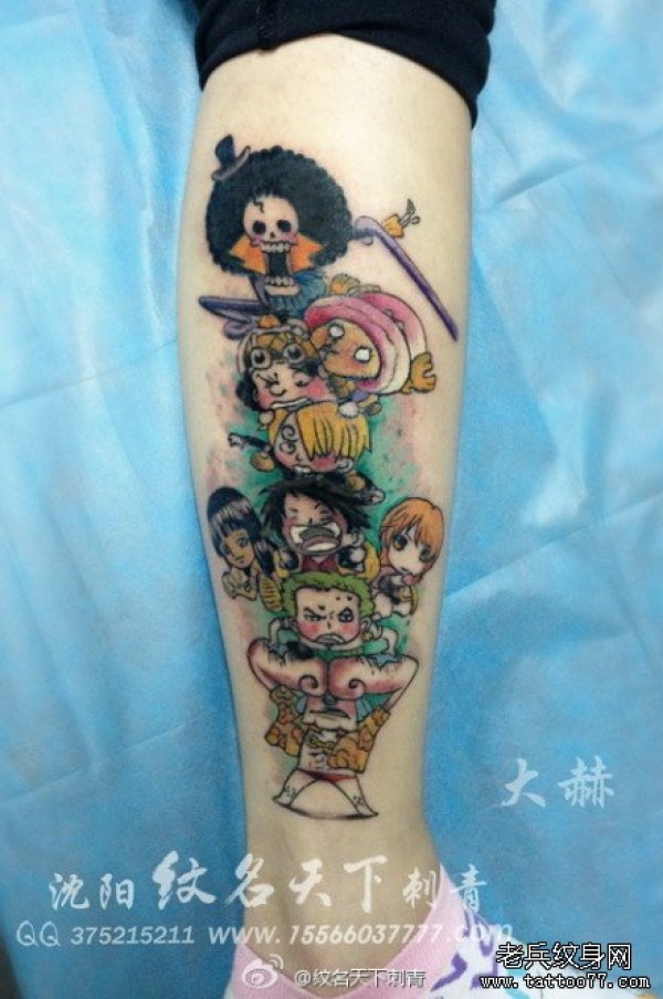 女生腿部可爱经典的海贼王草帽全体船员纹身图案